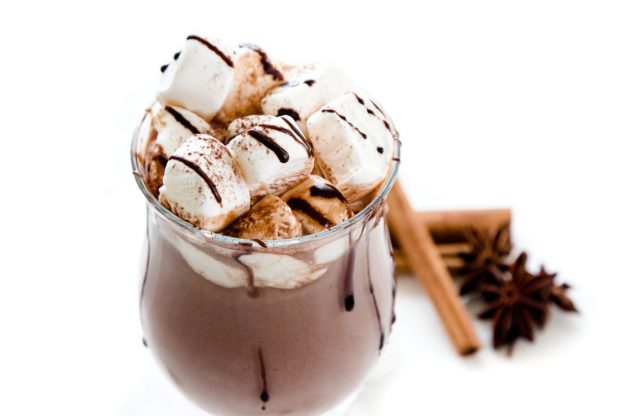 2. Die Heiße Schokolade in Gläser füllen. Darauf ein paar Marshmallows verteilen und eventuell noch mit flüssiger Schokolade dekorieren.