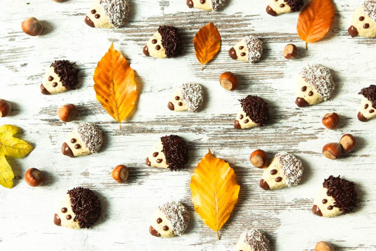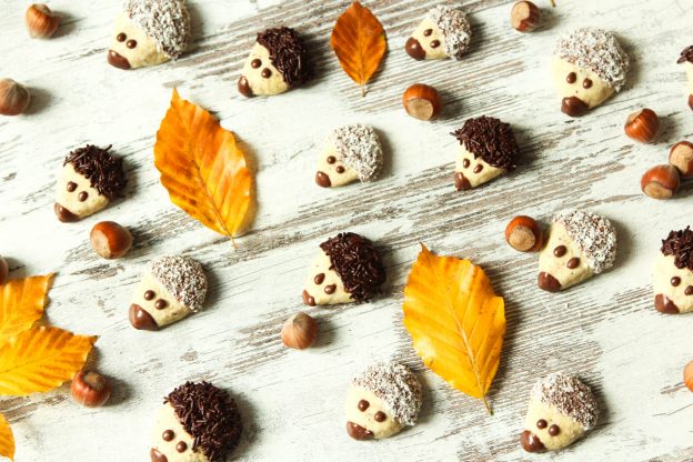 - Aus dem Teig kleine Stückchen abreißen und diese zu Kugeln formen (ca. 1 Teelöffel groß). Die Kugeln mit den Fingern vorne zu einer Spitze formen, sodass die Igel ein Gesicht bekommen.
