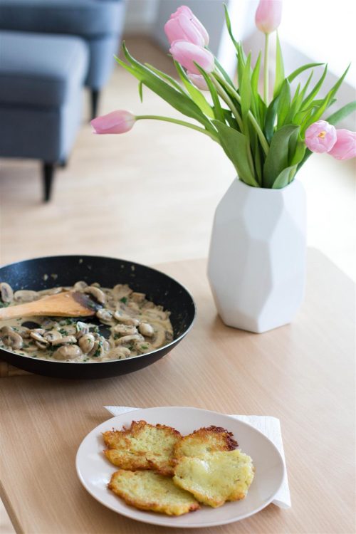 Hmm, die sehen gut aus. Ich glaub, ich mach am Wochenende auch mal wieder Kartoffelpuffer. Bei uns gibt es sie immer mit Apfelmus, aber die Idee mit der Pilzsauce finde ich auch gut.