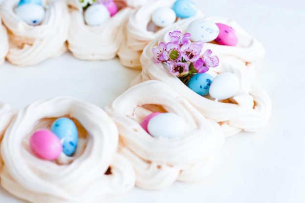 Die fertigen Neste kann man mit Schlagsahne und Früchten oder Kiebitz-Eiern dekorieren.