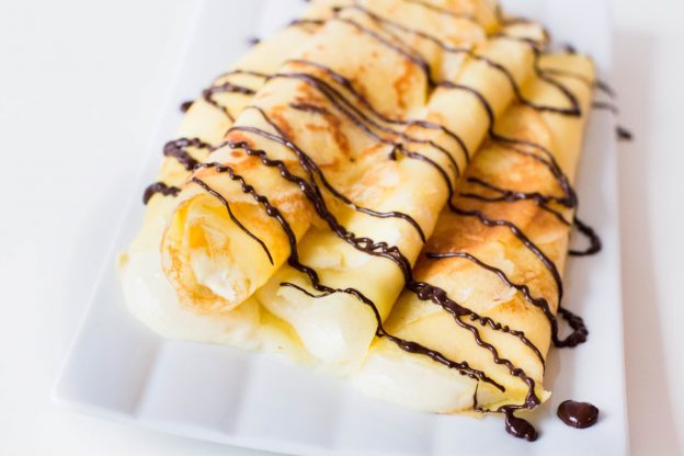 - Die Pfannkuchen mit der Quarkfüllung bestreichen und zusammenrollen oder zu Dreiecken falten.