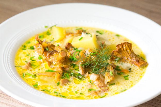 - Die Hitze reduzieren und die Suppe unter einem Deckel 15-20 Minuten kochen bis die Kartoffeln weich werden. Zum Schluss Dill und Schnittlauch hinzufügen.