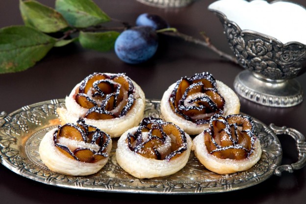 - Die Pflaumenscheiben auf dem Blätterteig nebeneinander legen, sodass sie leicht aufeinander überlappen. Am Ende des Blätterteiges 1 cm frei lassen. Dann die Pflaumen mit Vanillinzucker bestreuen und zusammenrollen. Die Enden fest zusammendrücken.
