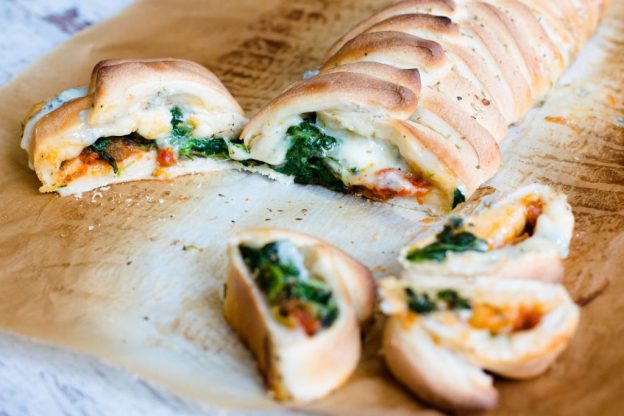 Ein Rezept für Pizza Zopf mit Spinat und Gorgonzola. Der Zopf wird aus Pizzateig zubereitet und mit Tomatensauce, Spinat, Gorgonzola und Mozzarella befüllt. Richtig lecker!