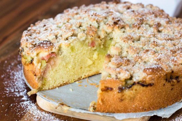 Ein Rezept für Rhabarberkuchen mit Streusel.