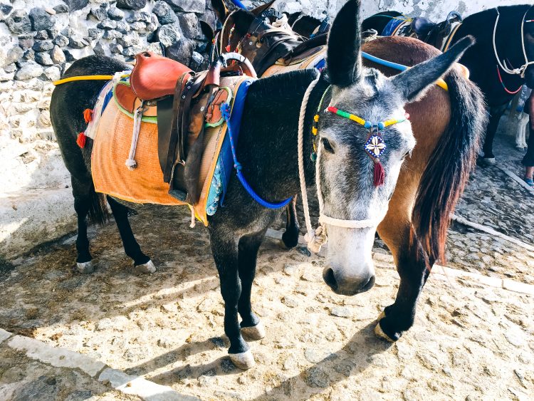 In Fira gibt es eine Seilbahn mit der man vom Berg runter zum Meer fahren kann. Ein Weg zu Fuß gibt es auch. Hier muss man viele Treppenstufen auf sich nehmen. Runter geht es ziemlich schnell, der Weg nach oben ist dann wieder eine kleine Herausforderung. Auf dem Weg trifft man immer wieder bunt bekleidete Esel die einen hoch und runter für ein paar Euro tragen können. Eine ziemlich anstrengende Angelegenheit für die armen Tiere. Diesen Service wollte ich bewusst nicht in Anspruch nehmen.