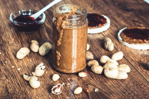 Serviervorschlag: Die Erdnussbutter auf Brot oder Reiswaffeln verteilen und mit Marmelade (Erdbeer, Himbeer oder andere Sorten) bestreichen.