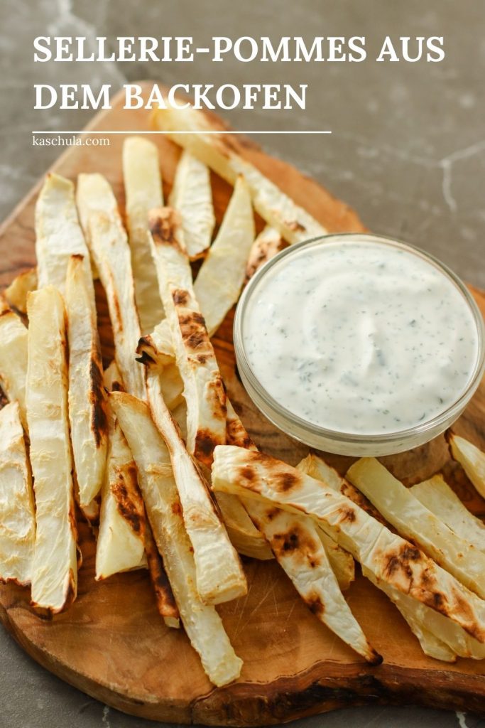 Ihr benötigt nur einen Knollensellerie, etwas Sals und Olivenöl. Richtig lecker schmecken die Pommes mit diesem selbst gemachten Sour Cream Dip.